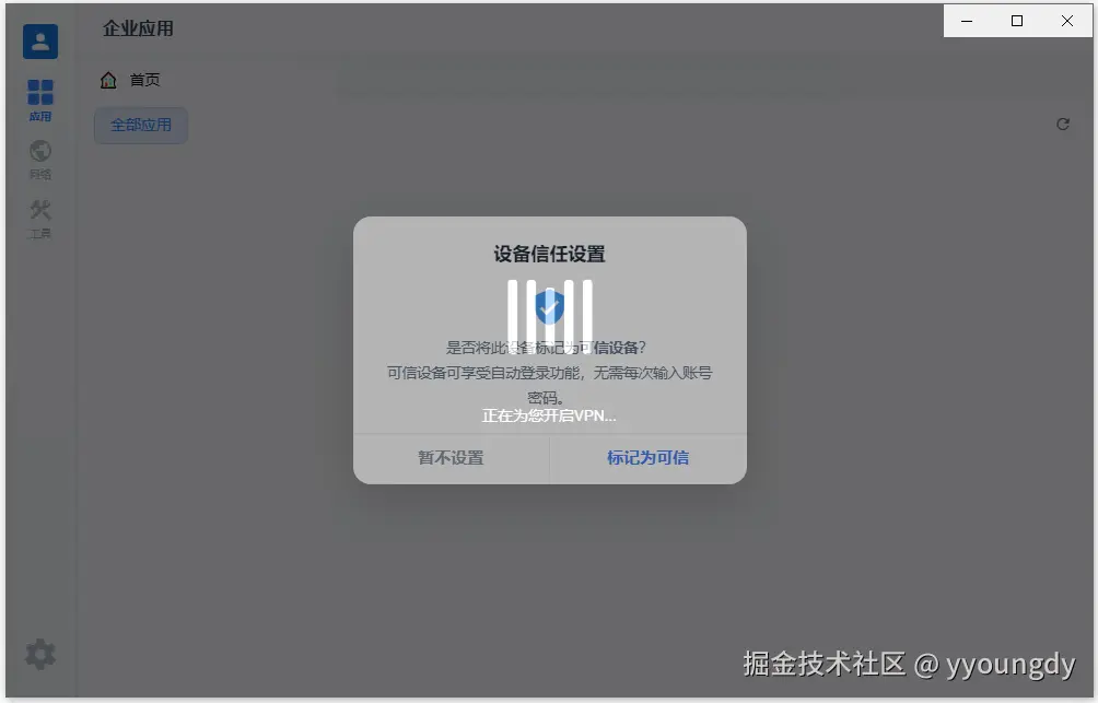 首次登录要求选择该设备是否是可信设备,如果开启了二次认证功能,是可信设备则可以免二次认证: