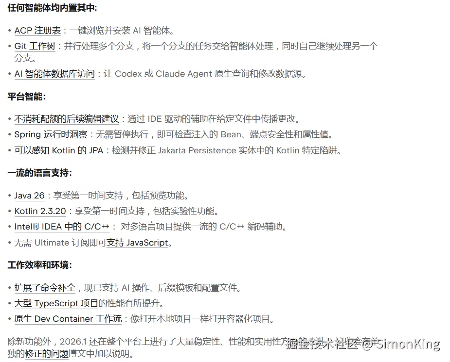 现在终于官方支持了,就在几天前,JetBrains正式发布了IntelliJ IDEA 2026.1。这一次的更新,不是简单的版本号递增,而是一次开发范式的智能跃迁——IDE正在从一个被动的“代码编辑器”,进化为一个开放的“AI智能体平台”。