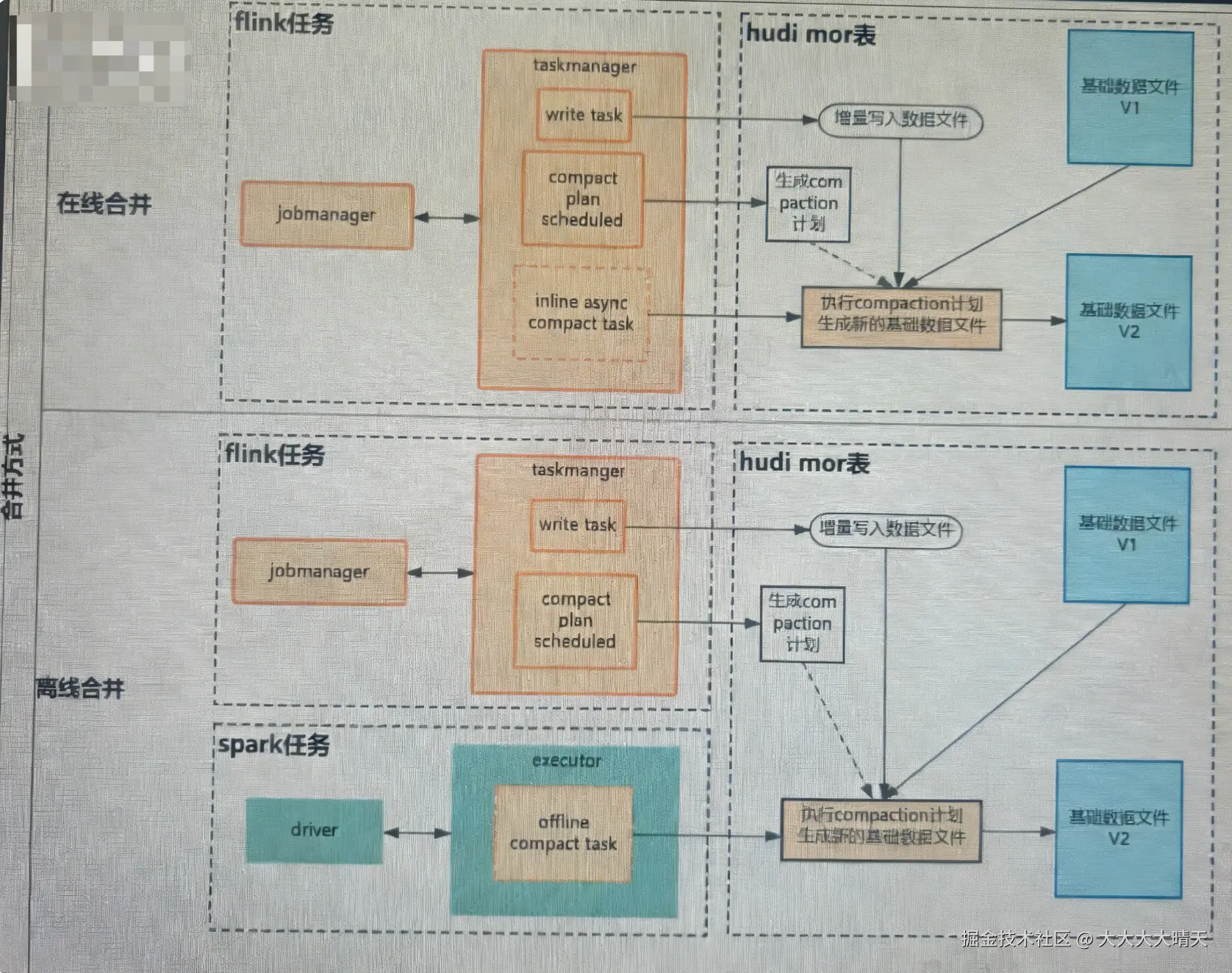 - 计划执行:分为在线合并(Flink 任务内异步执行)和离线合并(独立 Spark 任务执行)两种方式,二选一。