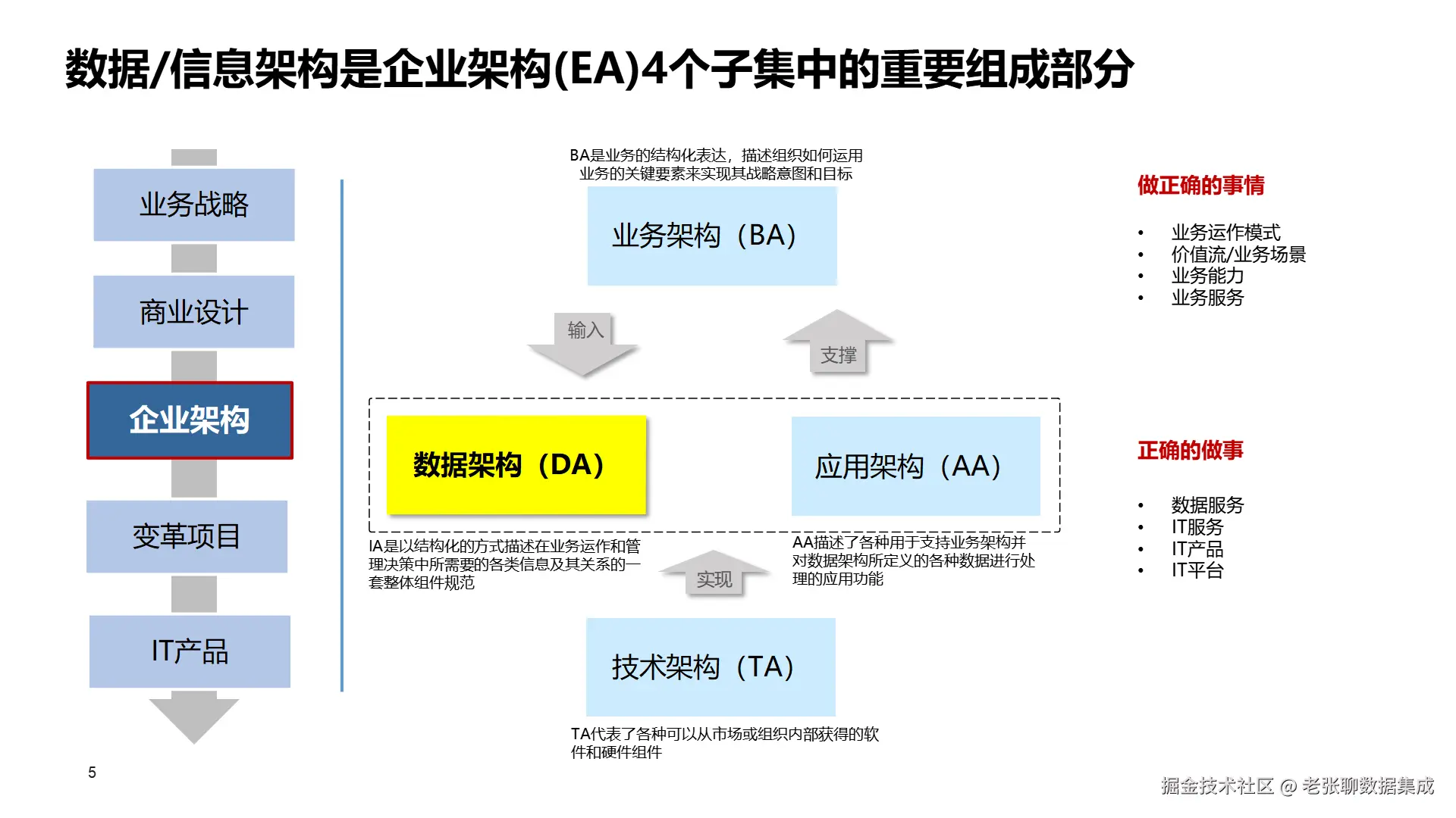 很多企业在推数字化转型的时候,都会提到企业架构(EA)。企业架构通常包含四个子集:业务架构(BA)、数据架构(DA)、应用架构(AA)、技术架构(TA) 。