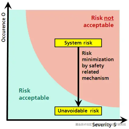识别不合理的风险就是概念阶段中提到的HARA分析导出安全目标的过程,识别到不合理的风险之后我们就要降低识别到的不合理的风险,具体降低的方法可以是优化开发流程、增加安全机制等等。