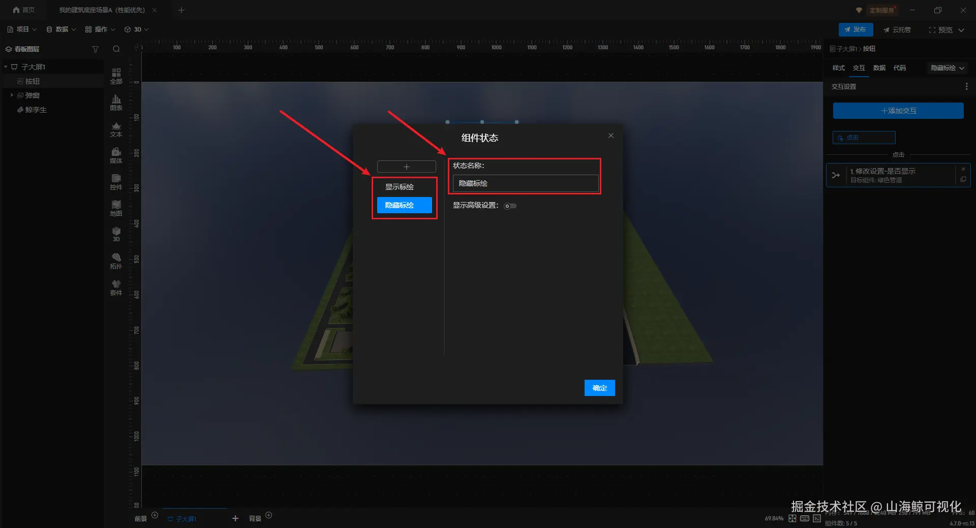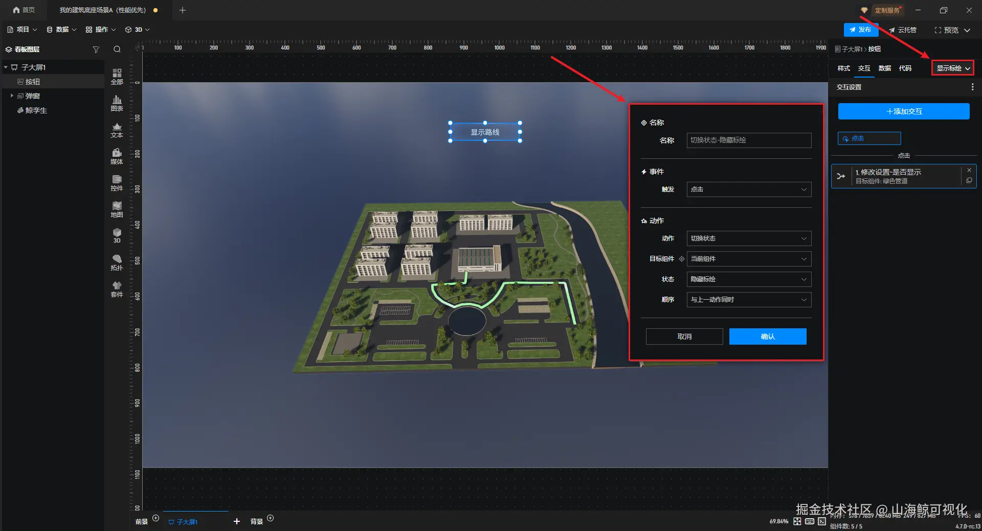 在制作三维可视化项目时,我们可能会需要添加一些场景标绘,并通过按钮进行控制。下面我们就来看一下,该如何设置通过按钮控制三维场景中标绘的显示和隐藏。