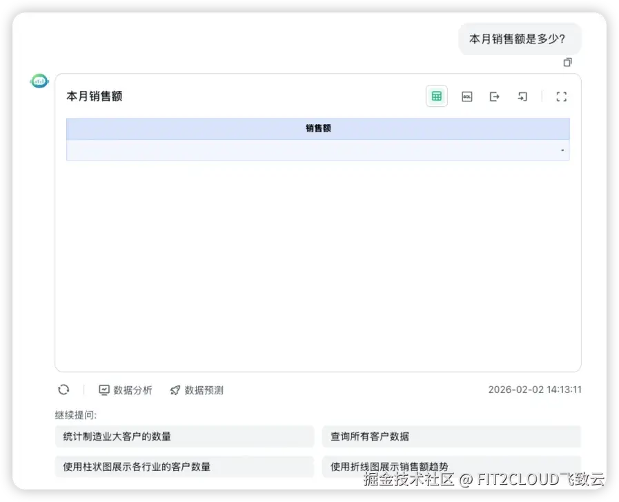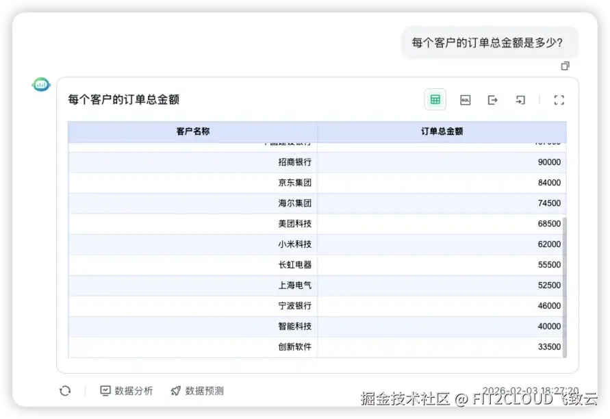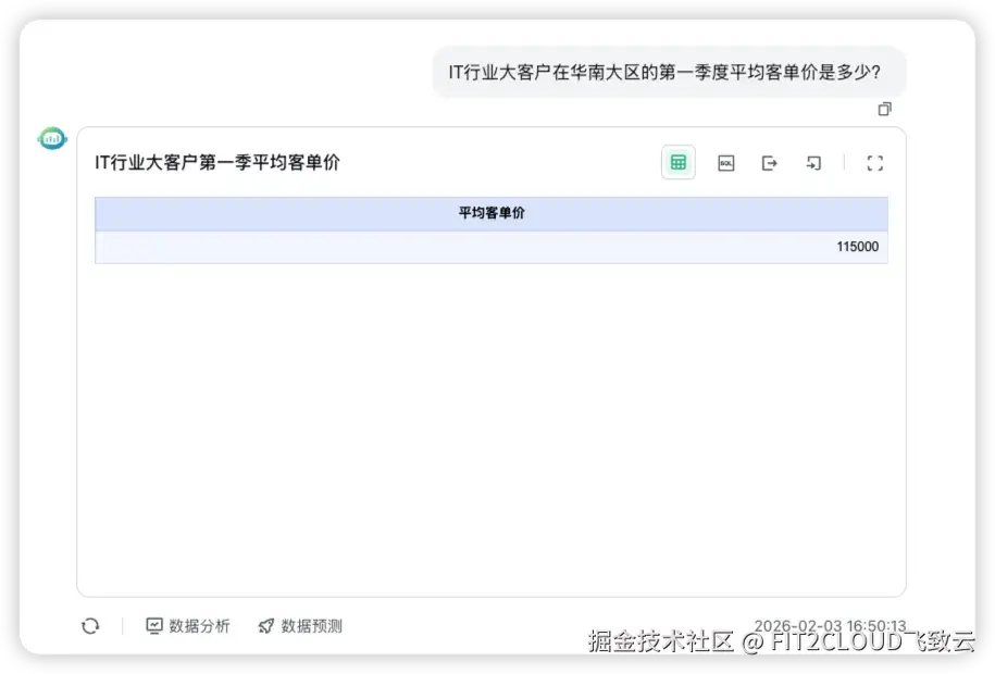 使用正确的SQL语句,SQLBot可以从数据源中查询出问题的正确结果,即正确回答“IT行业大客户在华南大区的第一季度平均客单价”这样的复杂问题: