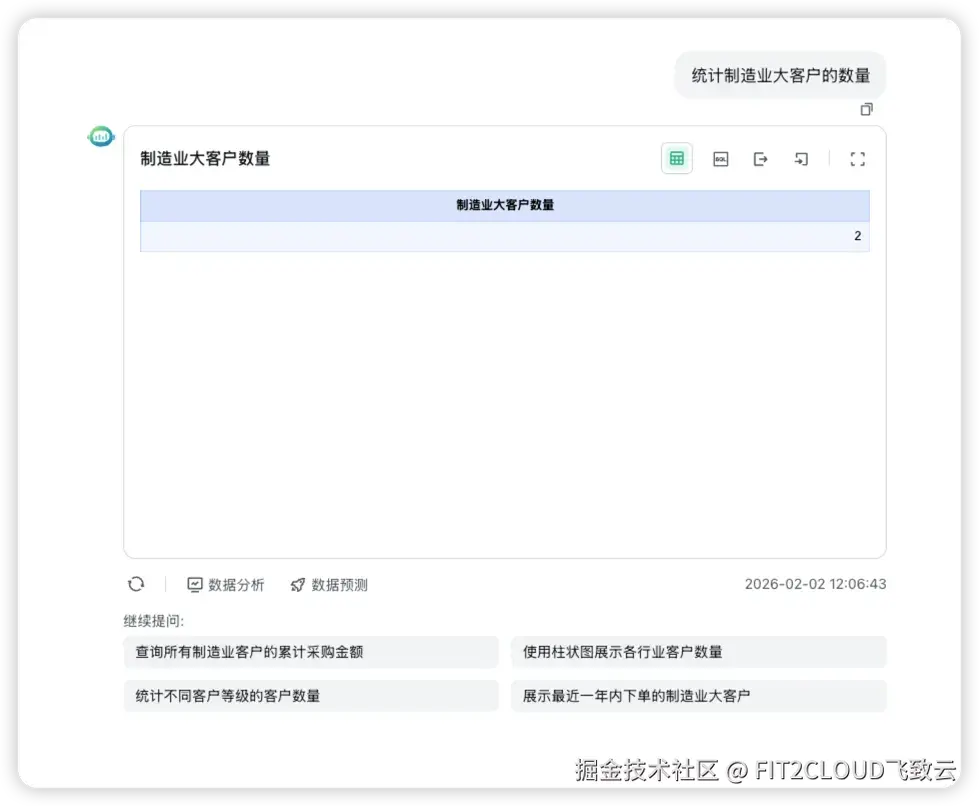 在SQLBot未经配置的状态下,当用户对模拟电商CRM系统数据源进行智能问数,提出“统计制造业大客户的数量?”的问题时,大模型生成的SQL语句如下: