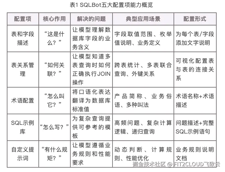 SQLBot所提供的五个配置项分别从表和字段描述(即表管理)、表关系管理(即表关联关系管理)、术语配置(即自定义术语)、SQL示例库(即示例SQL)和自定义提示词这五个维度对齐业务意图,各自承担明确作用,又可相互配合、层层增强,最终能够大幅提升自然语言转SQL语句的准确率、召回率与可用性。