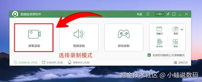 步骤一:想在笔记本上录制屏幕?先找到数据蛙录屏软件并双击打开,软件主页面会自动呈现所有可用的录制模式。提前了解各模式的适用场景很有必要:屏幕录制适合网课学习记录、桌面操作教学演示;游戏录制针对游戏录制需求,能稳定捕捉高帧率画面,避免出现丢帧问题;音频录制专注于声音采集,不包含画面,适合录制播客内容、会议语音纪要。本次我们选择屏幕录制模式,点击进入下一步操作。