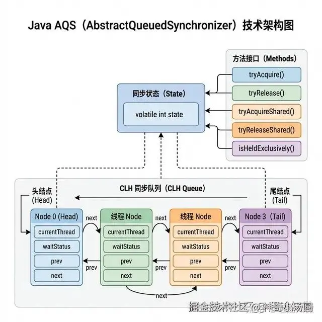 AQS 是面向对象设计中“解耦”和“复用”的巅峰之作。它将复杂的线程调度抽象为简单的状态管理,为 Java 构建了极其稳固的并发地基。作为中高级开发者,唯有透彻理解这个“底座”,才能在并发编程的海洋中游刃有余。