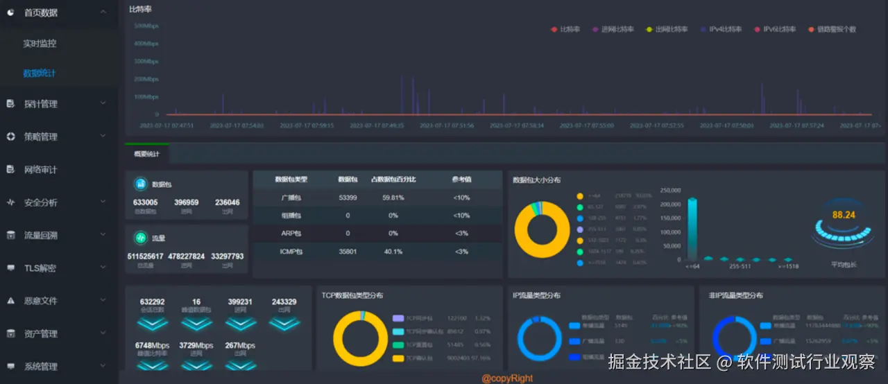 数据安全测试系统采用旁路监听、应用代理、网络引流等多种技术手段,实现对目标网络原始流量的实时采集。通过 DPDK(数据平面开发套件)、pfring 等高性能抓包技术,系统能够以线速处理最高 40Gbps 的网络流量,单节点(4U)支持 200T 本地存储空间,并可外挂扩展至 1PB,确保 7×24 小时无遗漏地记录原始流量数据。这种全流量采集能力为后续的深度分析和攻击溯源奠定了坚实基础。