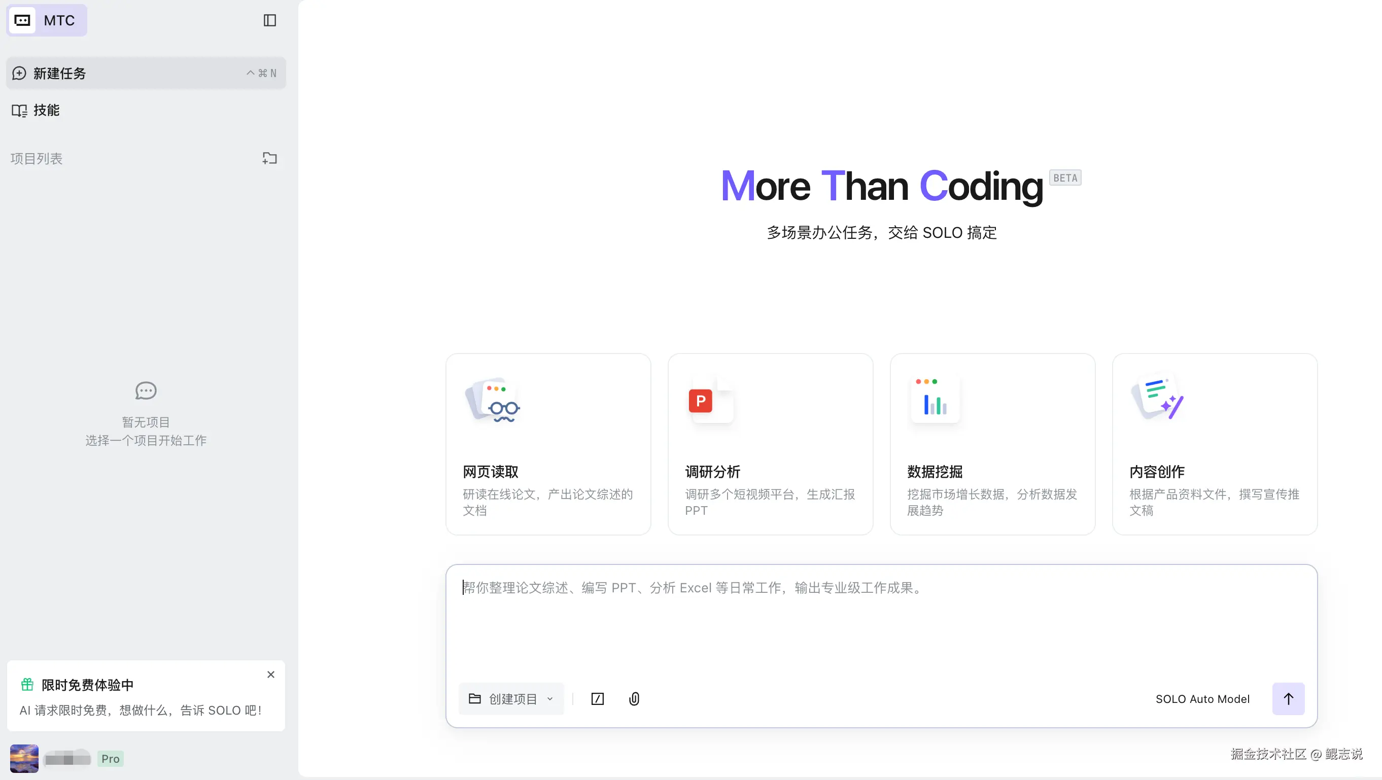 - MTC(More Than Coding)模式:这就是这次的 “跨界” 核心,面向代码开发之外的全产研工作场景,不管是产品写 PRD、运营做活动方案,还是数分处理数据,都能覆盖。