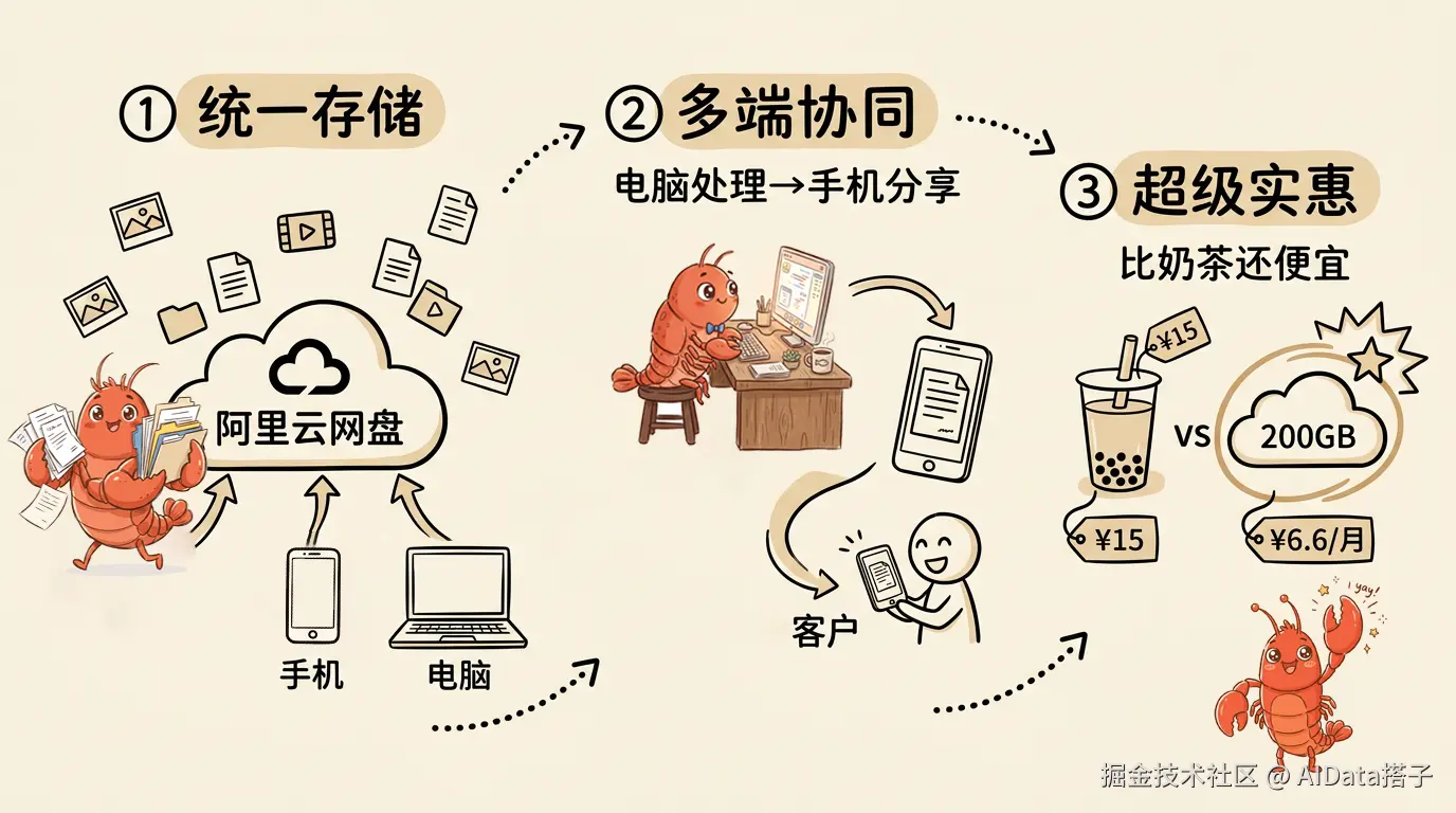过去,AI Agent 只能“看到”你电脑里的文件。手机拍的照片、视频、同事发的文档,它一概不知。现在,只要上传到阿里云网盘企业版,OpenClaw 就能直接读取。