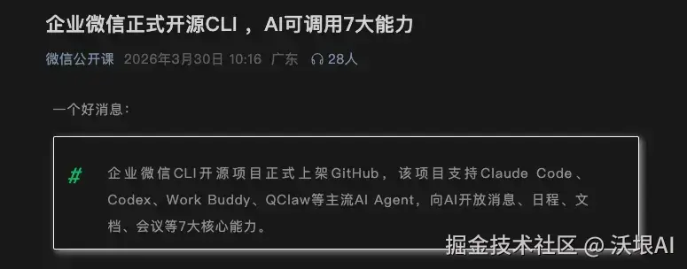 就在飞书开源CLI的第二天,企业微信也正式开源了自己的CLI工具,上线GitHub。开放的能力包括消息、日程、文档、智能表、会议、待办、通讯录,基本覆盖了日常办公的核心场景。
