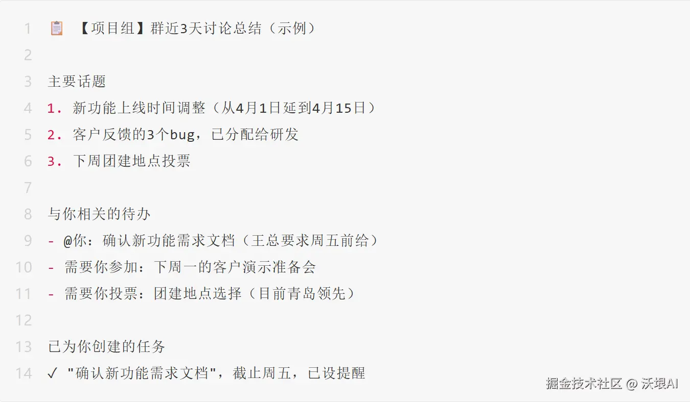 - 识别待办语句:从对话中提取"小王负责整理需求"、"周五前给反馈"这类表述。