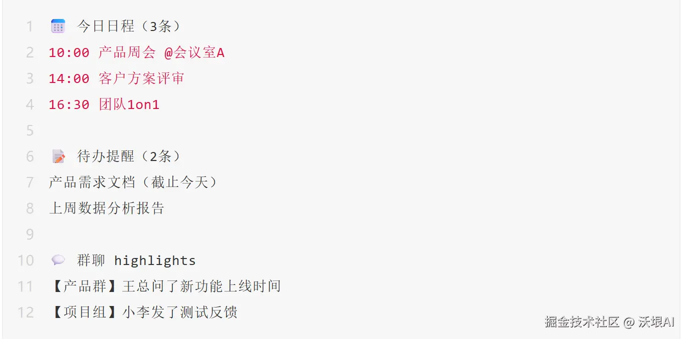 你可以让它按你喜欢的格式输出,也可以让它只提醒“有变化的”事项。我设置的是:如果日程有变动、或者有超过 10 条未读消息的群,才在简报里标出来。