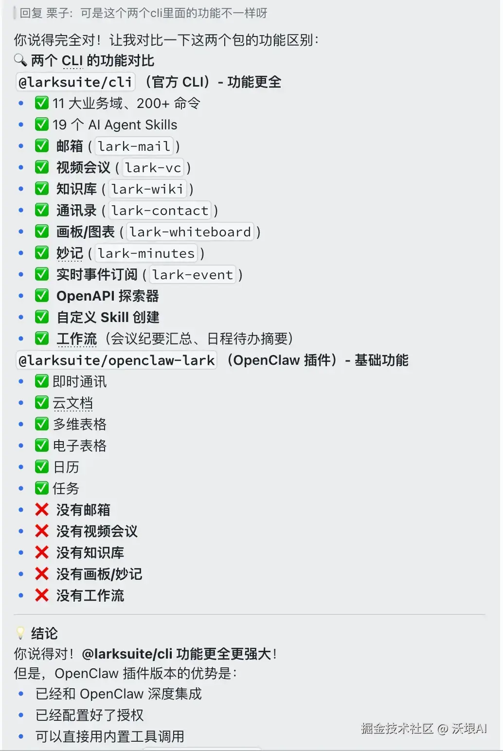 如果你之前用过OpenClaw的飞书插件,可能会有疑问:这次开源的CLI和之前的插件有什么不同?我该用哪个?