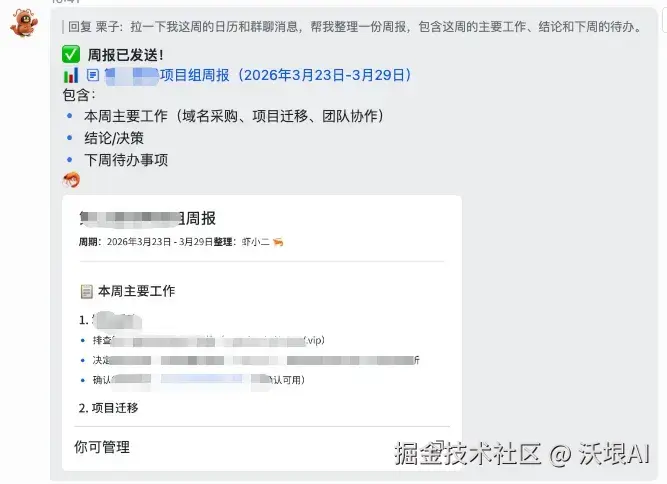 它不仅仅可以帮你完成周报,还可以直接帮你存在飞书文档里,甚至直接一键发送给对应的负责人。