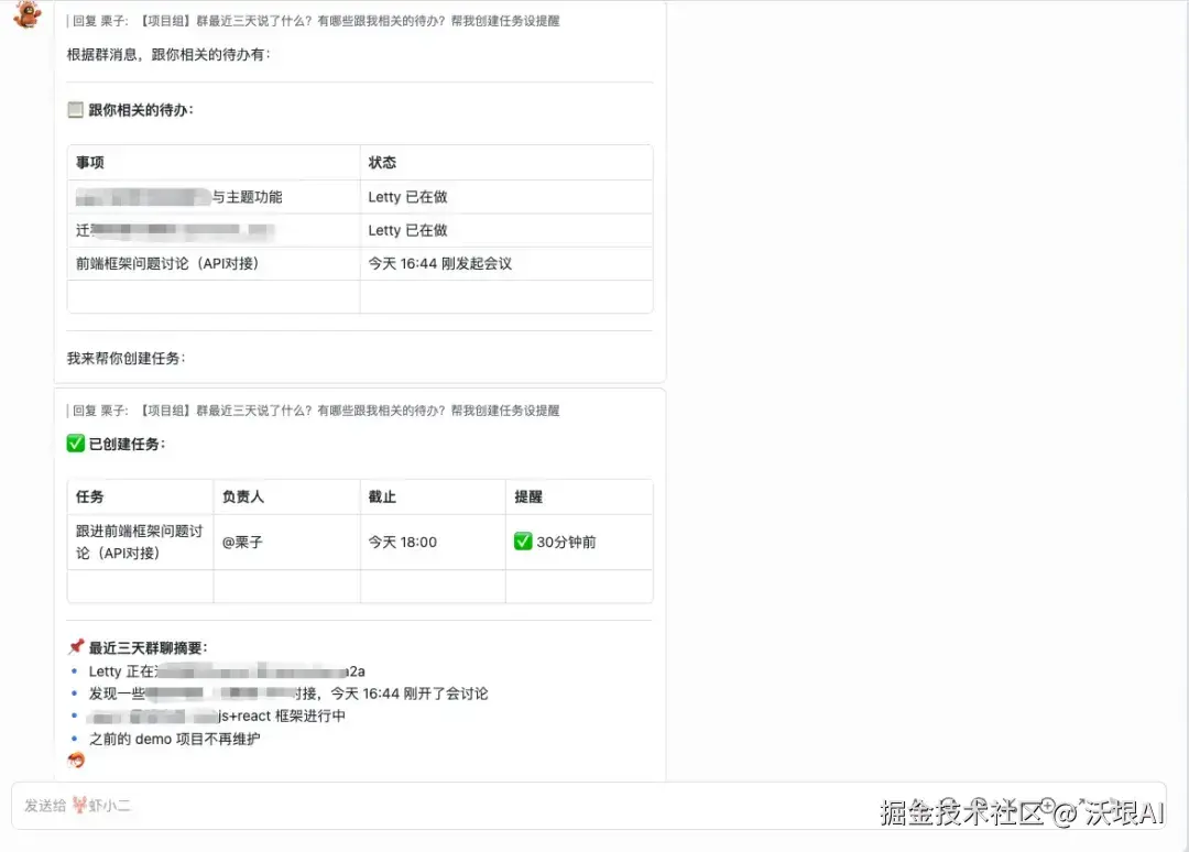 - 判断责任人:根据提到的名字匹配通讯录,自动@对应的人。
