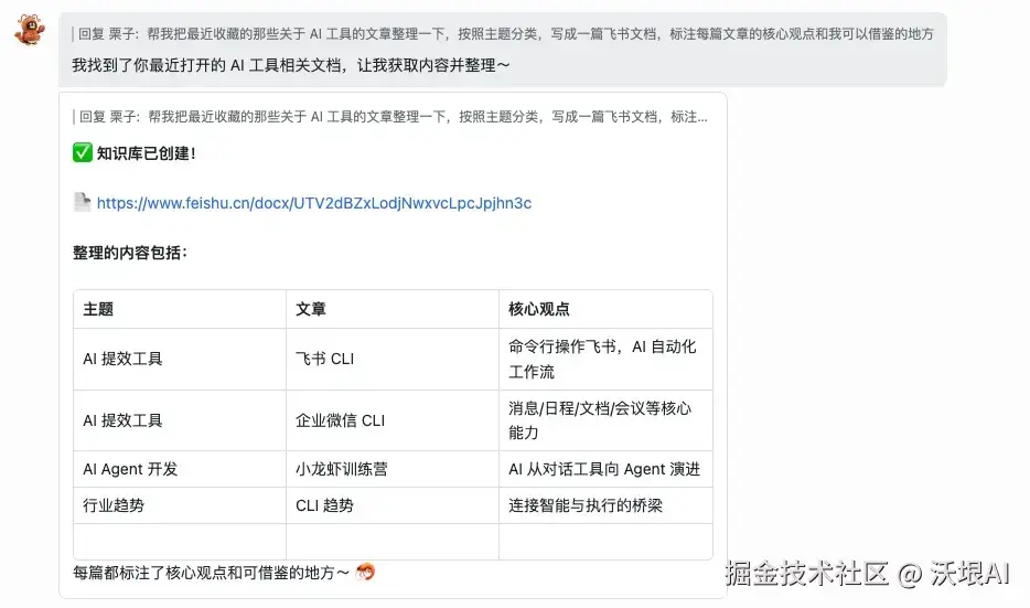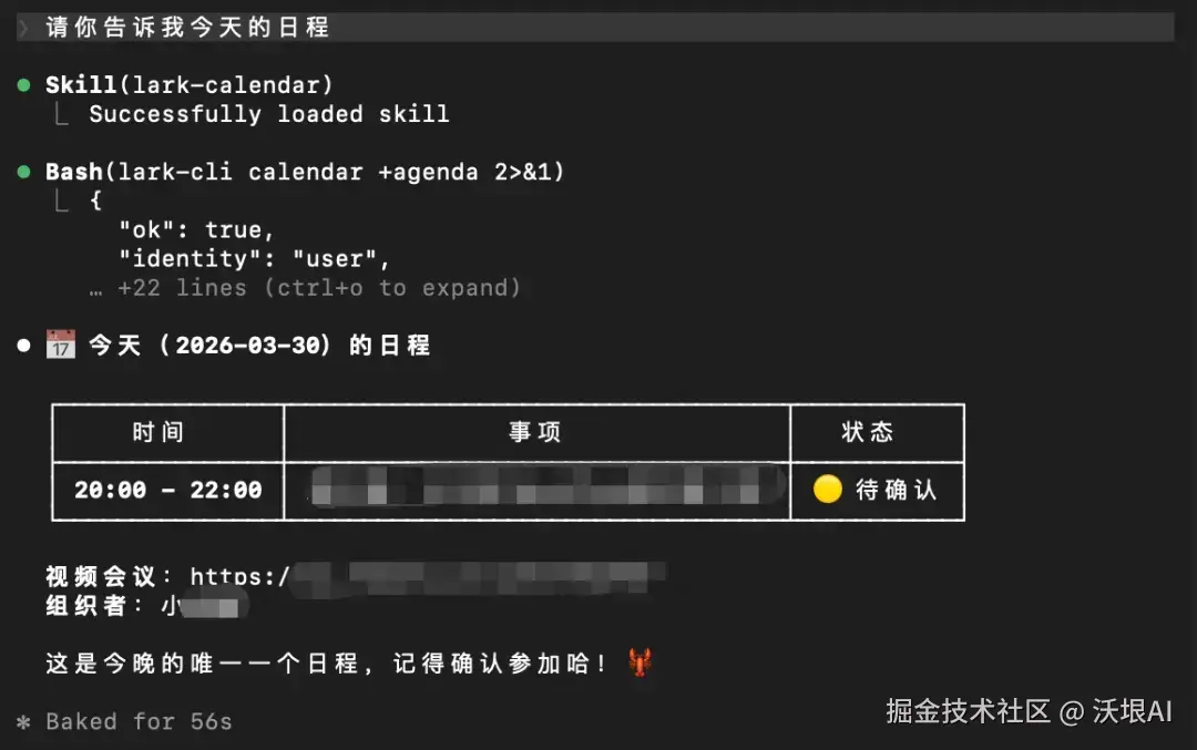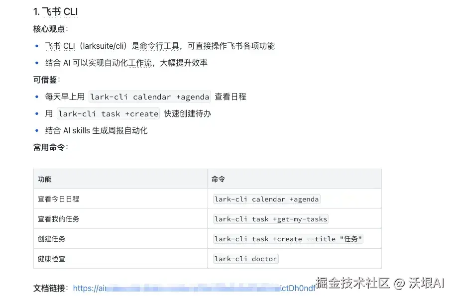 以前AI只能给你建议,因为它没有“手”——它动不了你的飞书、改不了你的文档、发不了你的消息。现在,CLI给它装上了这只手。同时,CLI也让AI能读取你的数据(日历、消息、文档),拿到执行所需的上下文。