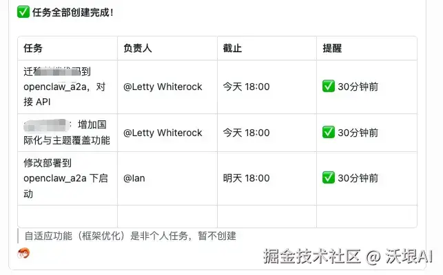 - 创建飞书任务:所有待办自动进任务列表,责任人收到通知。