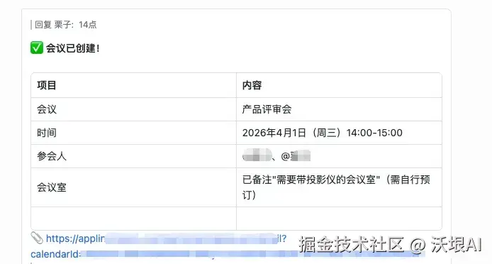- 发通知: 给所有人发飞书消息,"已为您预约下周三14:00-15:00产品评审会,地点:会议室A"。