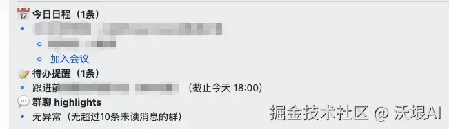 效果是什么? 以前我早上要花10-15分钟在飞书里翻来翻去,现在30秒看完简报,心里有数了。更重要的是,我不会再漏掉那些藏在群聊里的待办。以前经常开会时有人随口说“那个东西弄一下”,当时没记,后来就忘了。现在AI会主动帮我catch住这些。