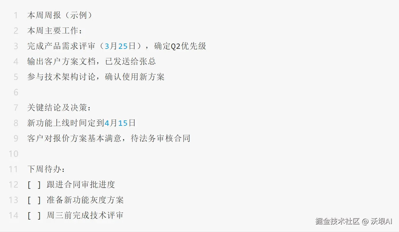 AI会基于我的日历事件、参与过的会议、群聊里的讨论,整理出一份结构化的周报,当然你也可以让它按照你自己或者公司要求的格式输出,比如: