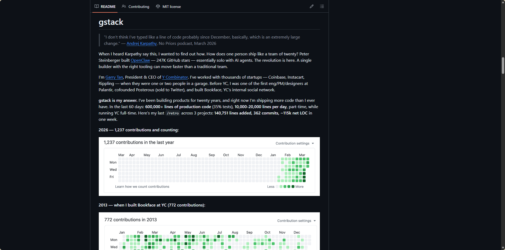 他说自己在过去 60 天里写了 60 万行生产代码,平均每天 1-2 万行,而且是在全职管理 YC 的情况下。