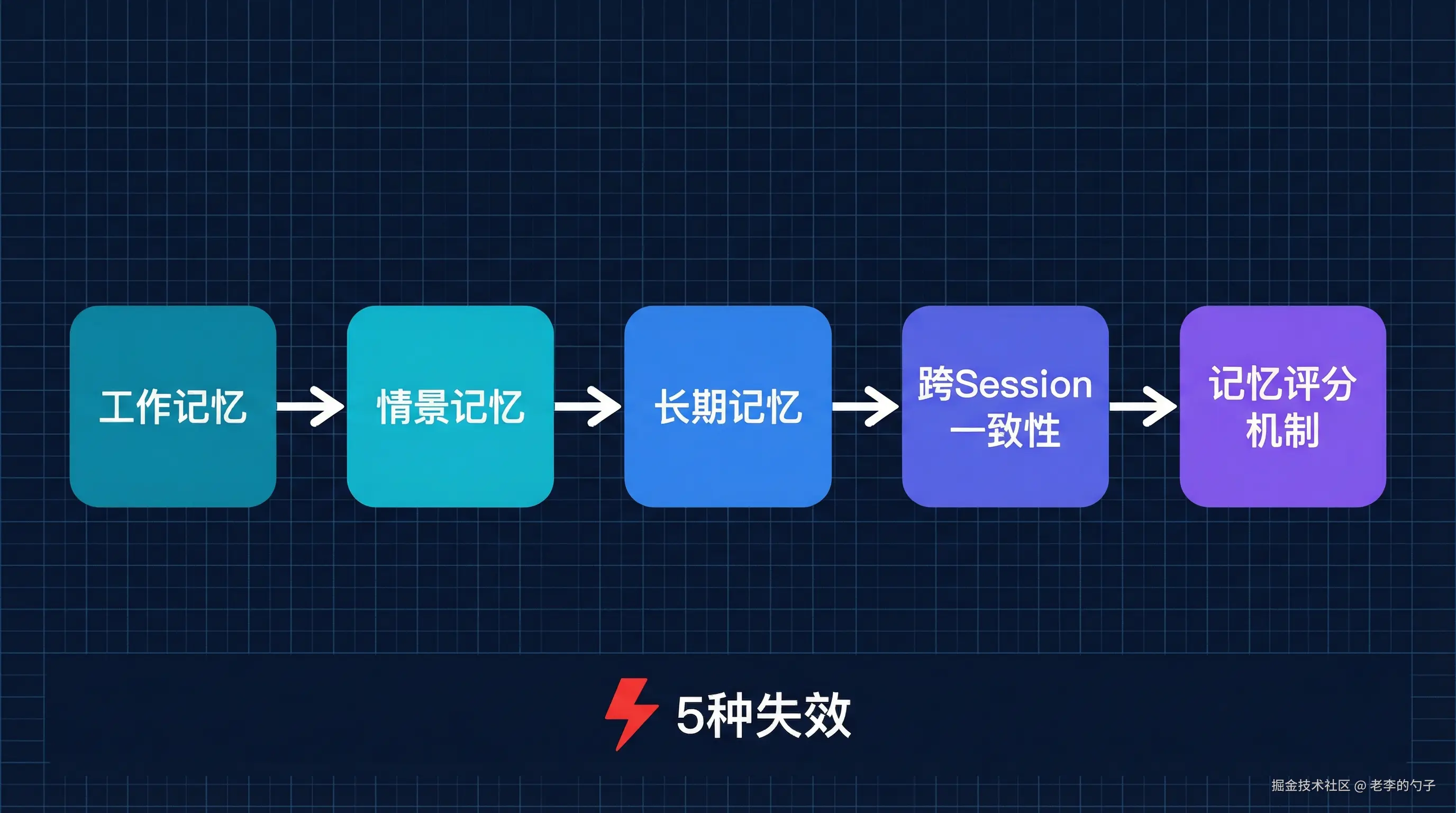 Agent 的"记忆"并非黑箱。它由多个独立环节组成——工作记忆管理、情景记忆提取、长期记忆存储、跨 Session 一致性保障、记忆置信度评估。任意一环断裂,都会表现为同一个症状:失忆。