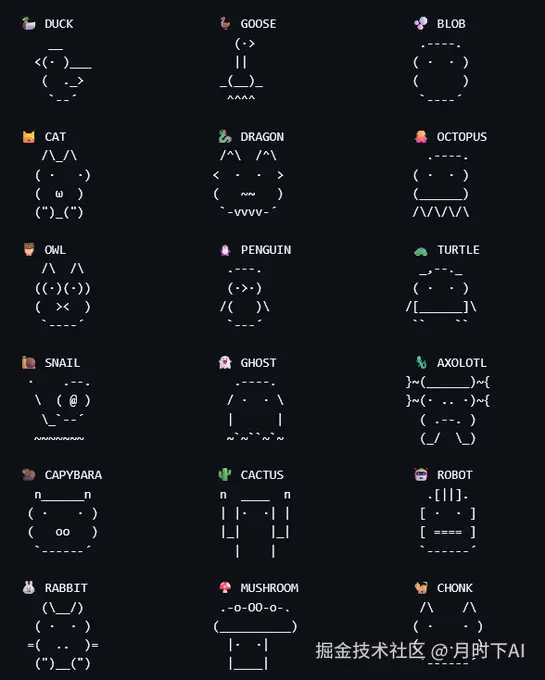 鸭(duck)、鹅(goose)、斑点(blob)、猫(cat)、龙(dragon)、章鱼(octopus)、猫头鹰(owl)、企鹅(penguin)、乌龟(turtle)、蜗牛(snail)、鬼(ghost)、蝾螈(axolotl)、水豚(capybara)、仙人掌(cactus)、机器人(robot)、兔子(rabbit)、蘑菇(mushroom)、大胖墩(chonk)...