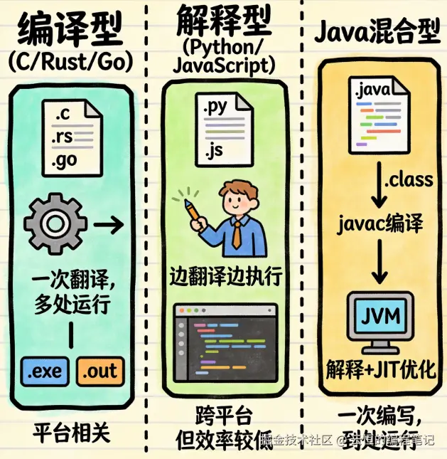 计算机的CPU只认二进制,我们写的高级语言代码怎么变成机器能懂的东西?这就靠翻译器,它有三种工作模式: