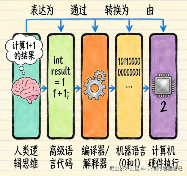 想象一下,你和一个只会说二进制(0和1)的外星人交朋友。你说的每句话,都得先翻译成0和1的组合,外星人才能理解。编程语言就是这个"翻译官",它把人类相对自然的表达方式(比如print("Hello"))转换成计算机能直接执行的二进制指令。