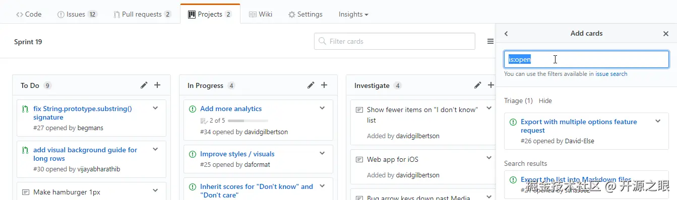 如果你想把你的issues添加到你的项目管理中来,你可以在页面右上方点击Add Cards搜索你想添加的,这里的搜索有特殊的语法,比如输入is:pr is:open,意味着你可以找到所有打开的PRs,如果你想修复bugs,输入label:bug。