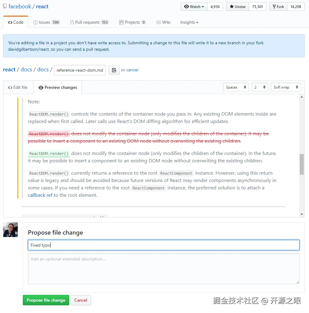 在GitHub上打开一个文件(任何仓库的任何文件),在页面的右上角有一个像小铅笔的按钮。点击它,你就可以编辑文件了。当你编辑完成,点击Propose file change,GitHub将为你fork这个仓库,然后创建pull request。