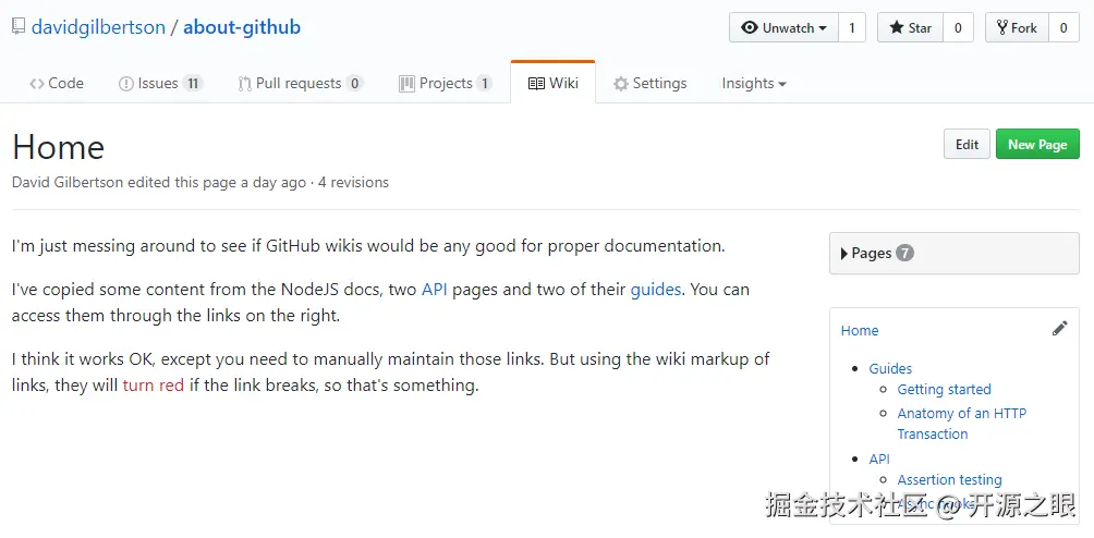 我先创建一个GitHub wiki,我从NodeJS文档找了几个页面作为wiki的页面,然后创建一个侧边导航来模拟实际的结构。侧边栏一直存在,不会对当前页面高亮。