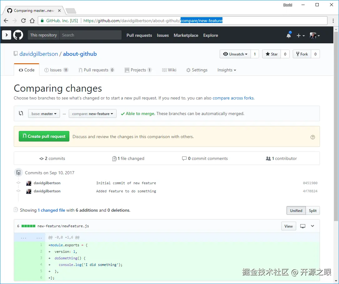与主干对比,两个分支对比,输入/compare/**integration-branch...**my-branch
