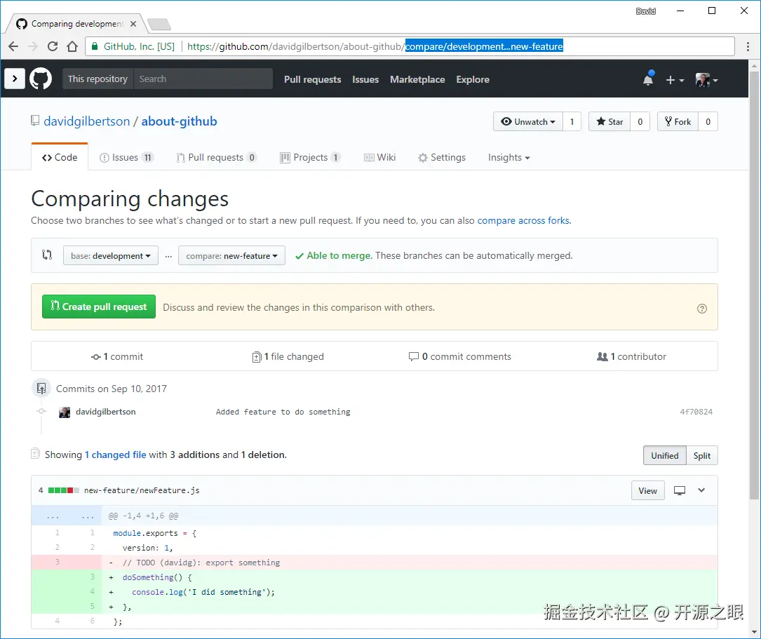 GitHub的页面导航已经做的很好了,但是有些时候直接在导航栏中输入会更快。比如你想跳转到一个分支,看下它与主干的区别,就可以直接在你仓库的后面输入/compare/branch-name: