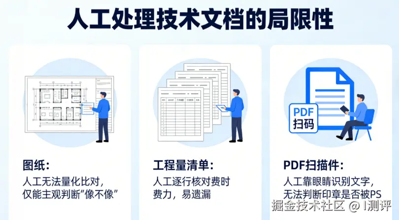 图纸,人工只能看“像不像”,无法量化比对。工程量清单,几十页的数字,人工逐行核对,费时费力还容易漏。PDF扫描件里的文字,人工只能靠眼睛认,印章是否被PS过,根本看不出来。
