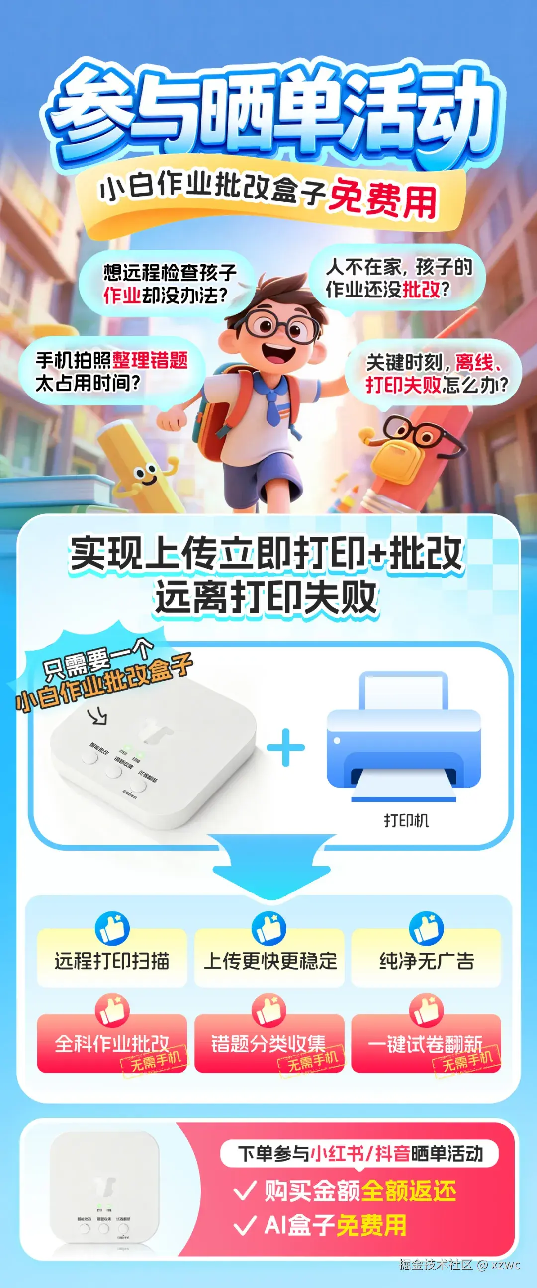 针对这一普遍痛点,我们推出了筹备2年的全新解决方案:全新一代小白作业批改盒子。而且还有一个好消息,新品邀请大家“免费内测”,现在参与晒单活动,即可享受全额返现,相当于免费使用这款产品!
