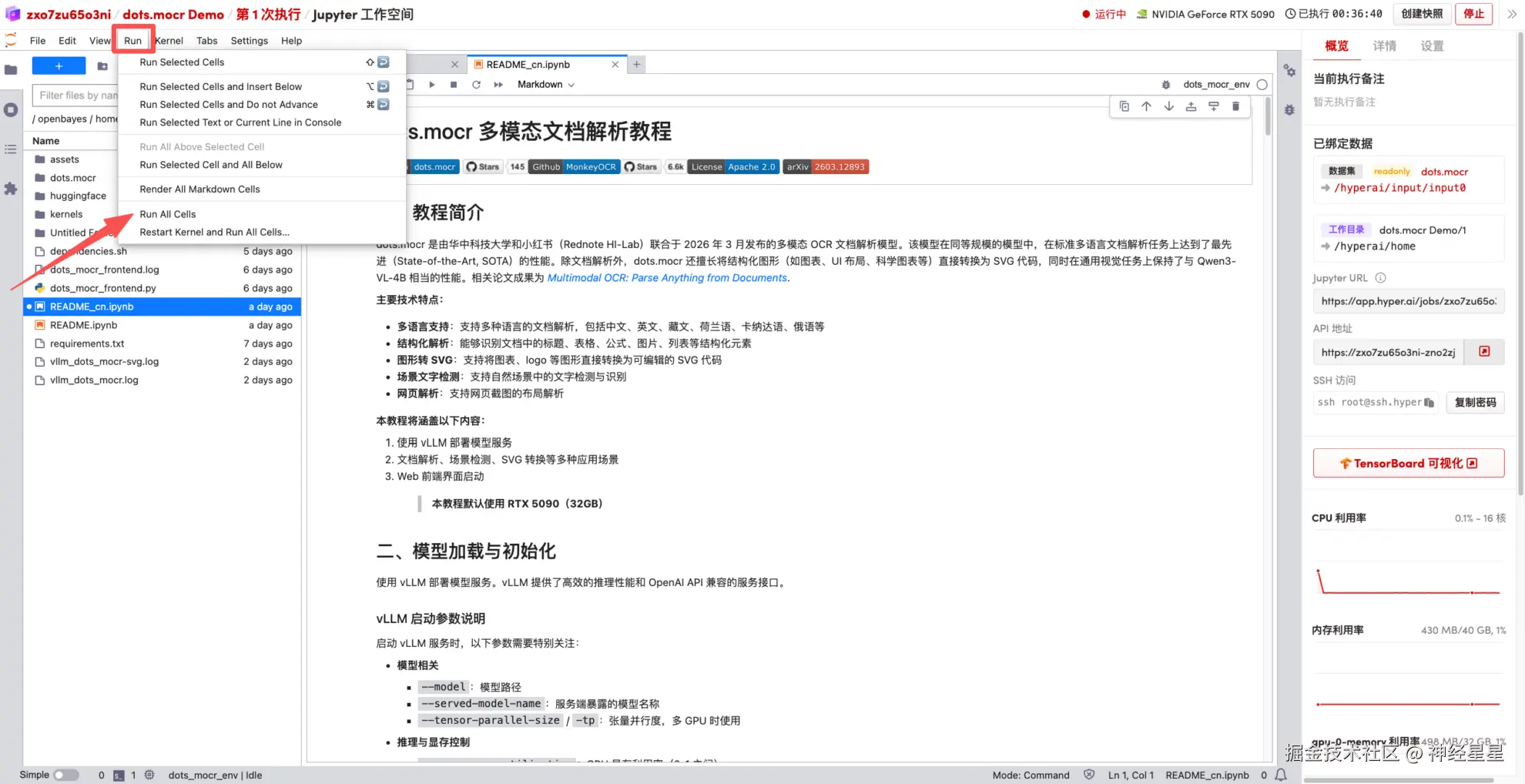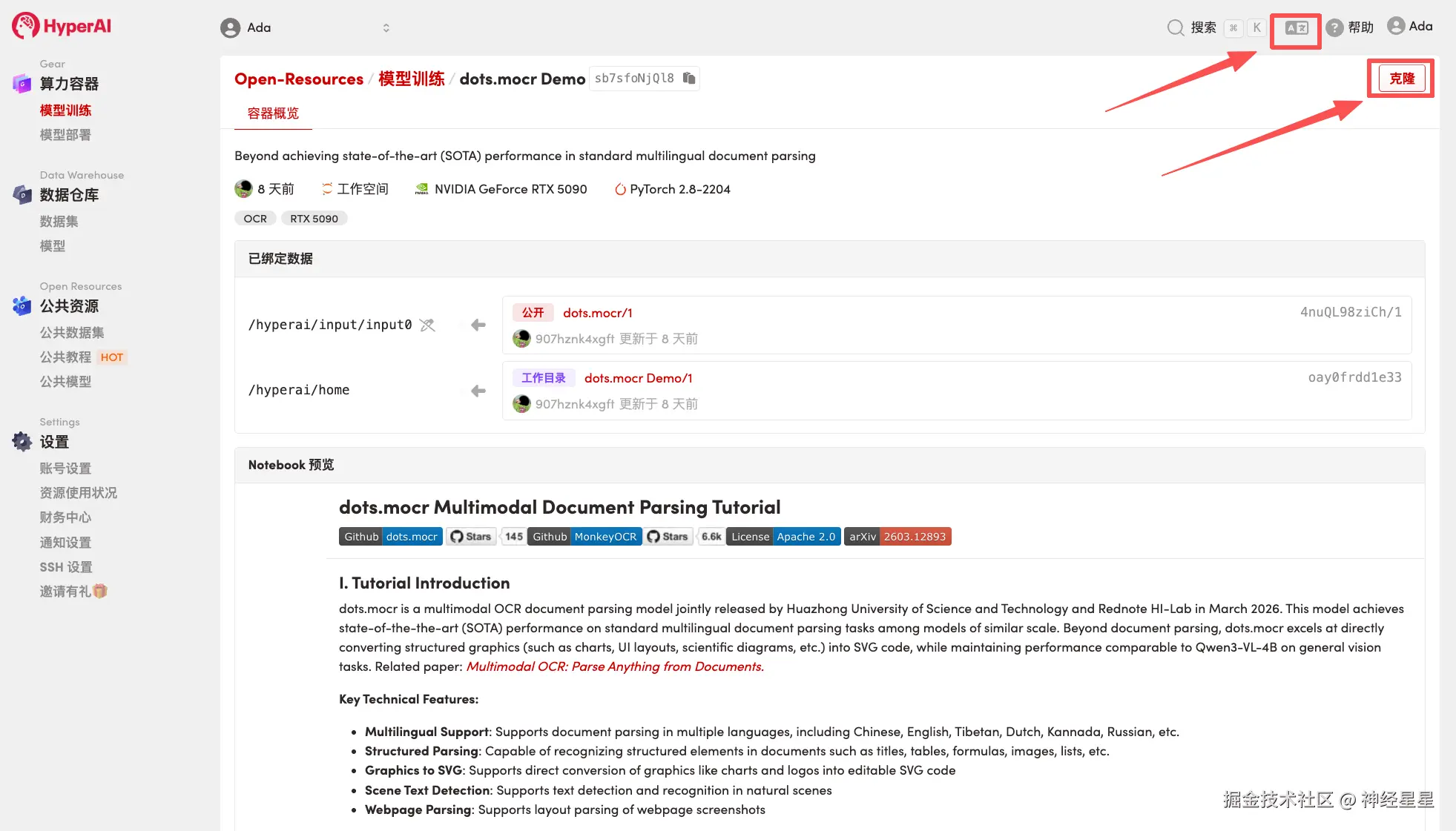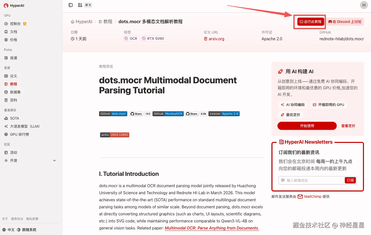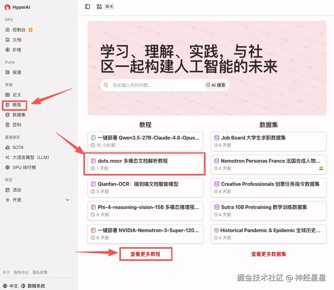 1.进入 hyper.ai 首页后,选择「教程」页面,或点击「查看更多教程」,选择「dots.mocr 多模态文档解析教程」,点击「在线运行此教程」。