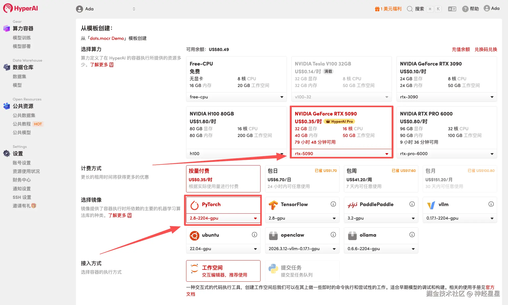 3.选择「NVIDIA GeForce RTX 5090」以及「PyTorch」镜像,按照需求选择「Pay As You Go(按量付费)」或「Daily Plan/Weekly Plan/Monthly Plan(包日/周/月)」,点击「Continue job execution(继续执行)」。