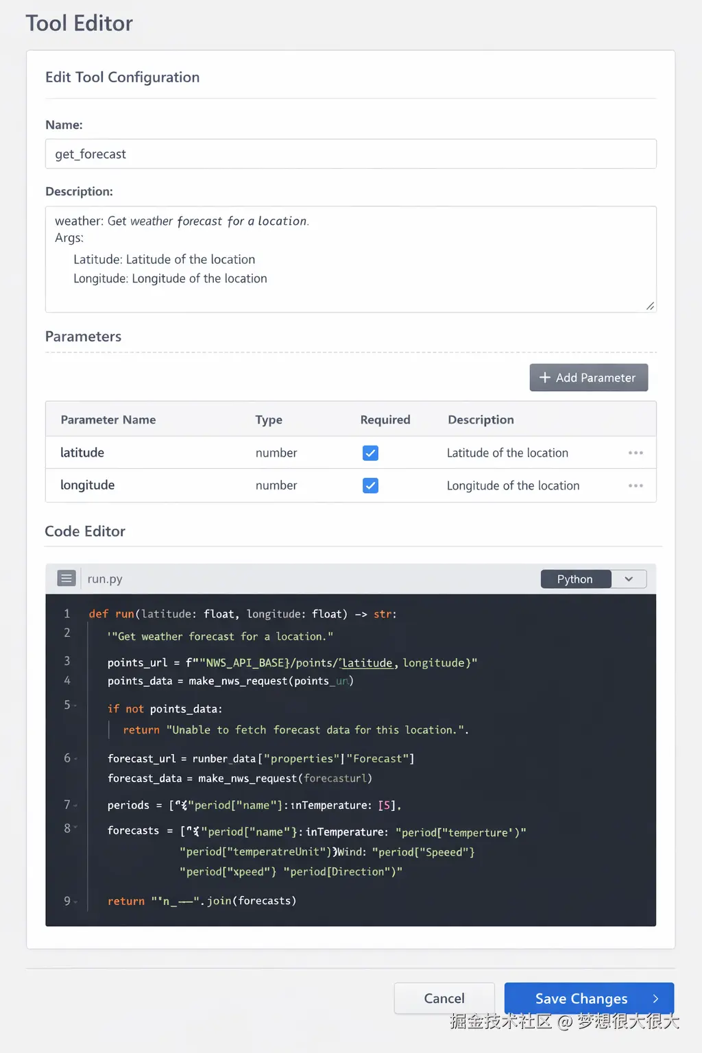 目前为了简化演示,我们使用 tools.json 文件来模拟数据库,存储所有的 Tool 配置。实际项目中,你完全可以把这些数据存入 MySQL、PostgreSQL 或 MongoDB 等数据库中,甚至进一步开发一个 Web 可视化配置管理系统(包含表单 + 在线代码编辑器),让用户可以通过界面轻松新增、编辑和删除 Tool。