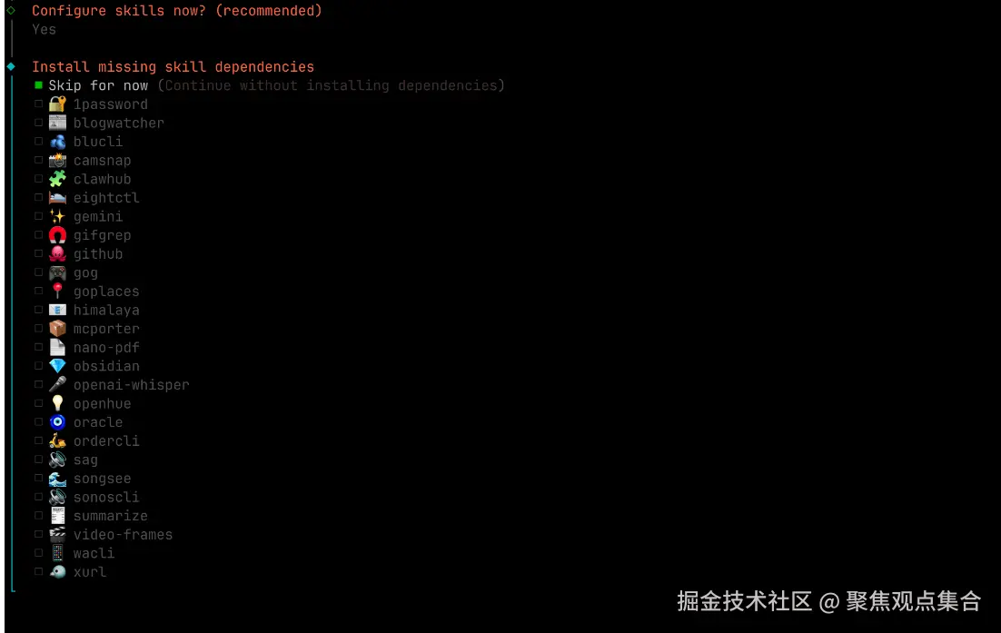 - 选择你 OpenClaw 的技能和一些配置,选择 Yes