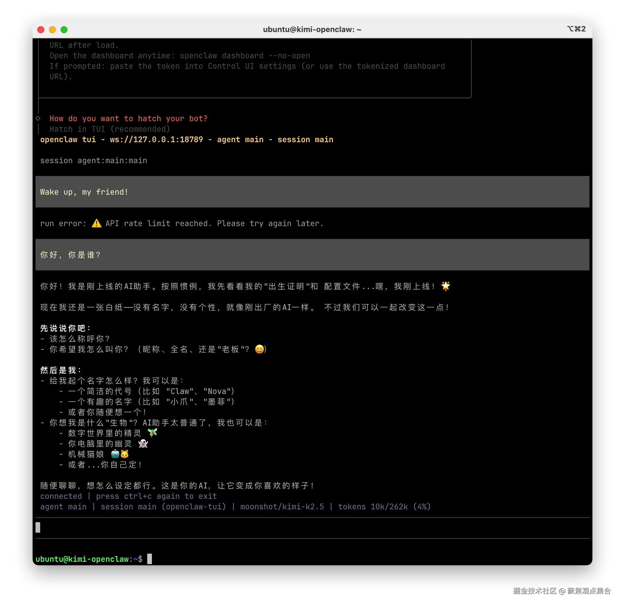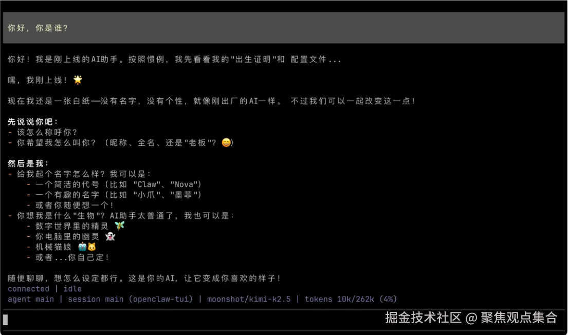 - 输入 openclaw tui 可返回 tui 继续聊天