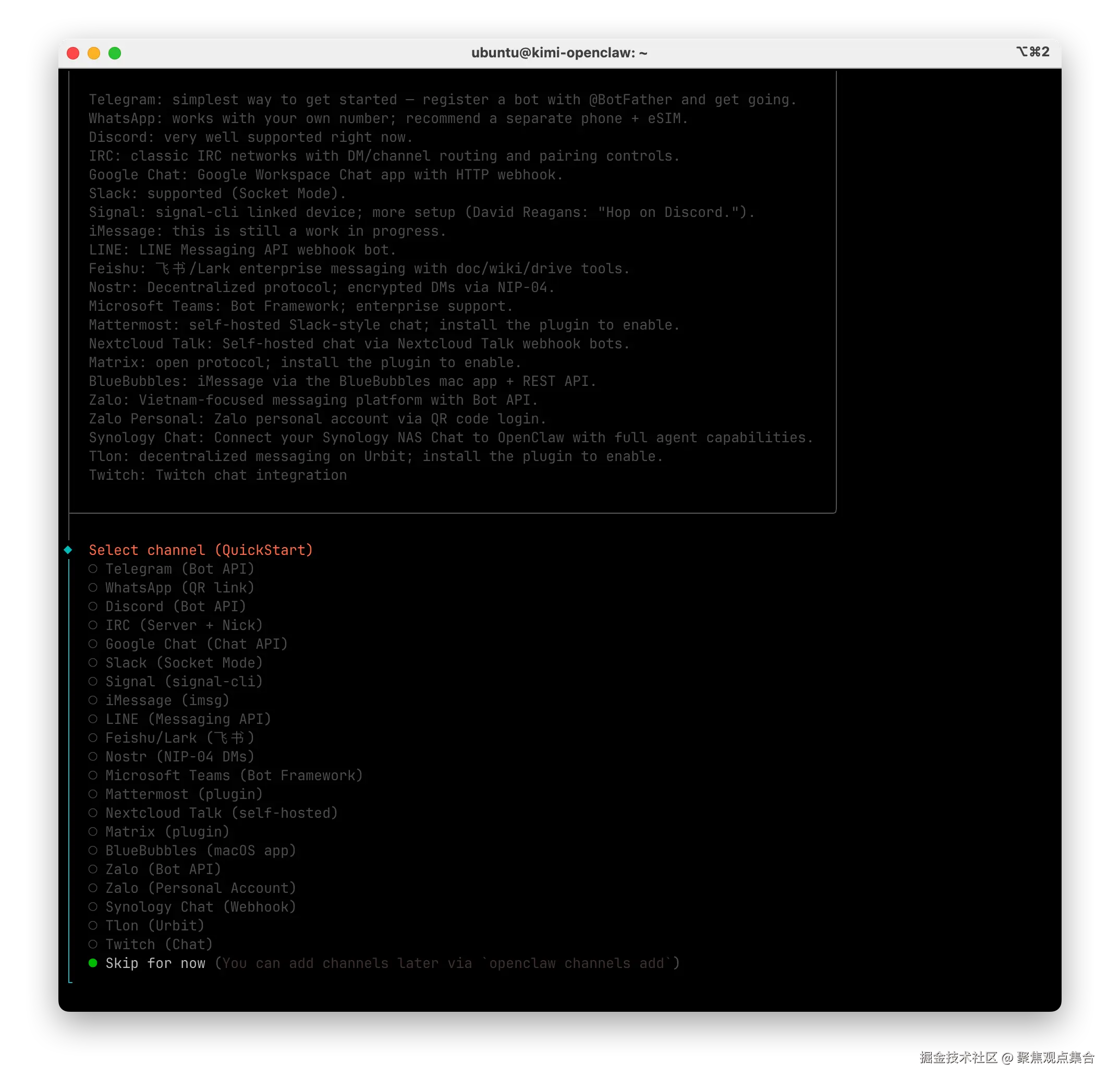 - 选择与 OpenClaw 聊天的载体,我们可以先跳过,使用 tui 进行体验。