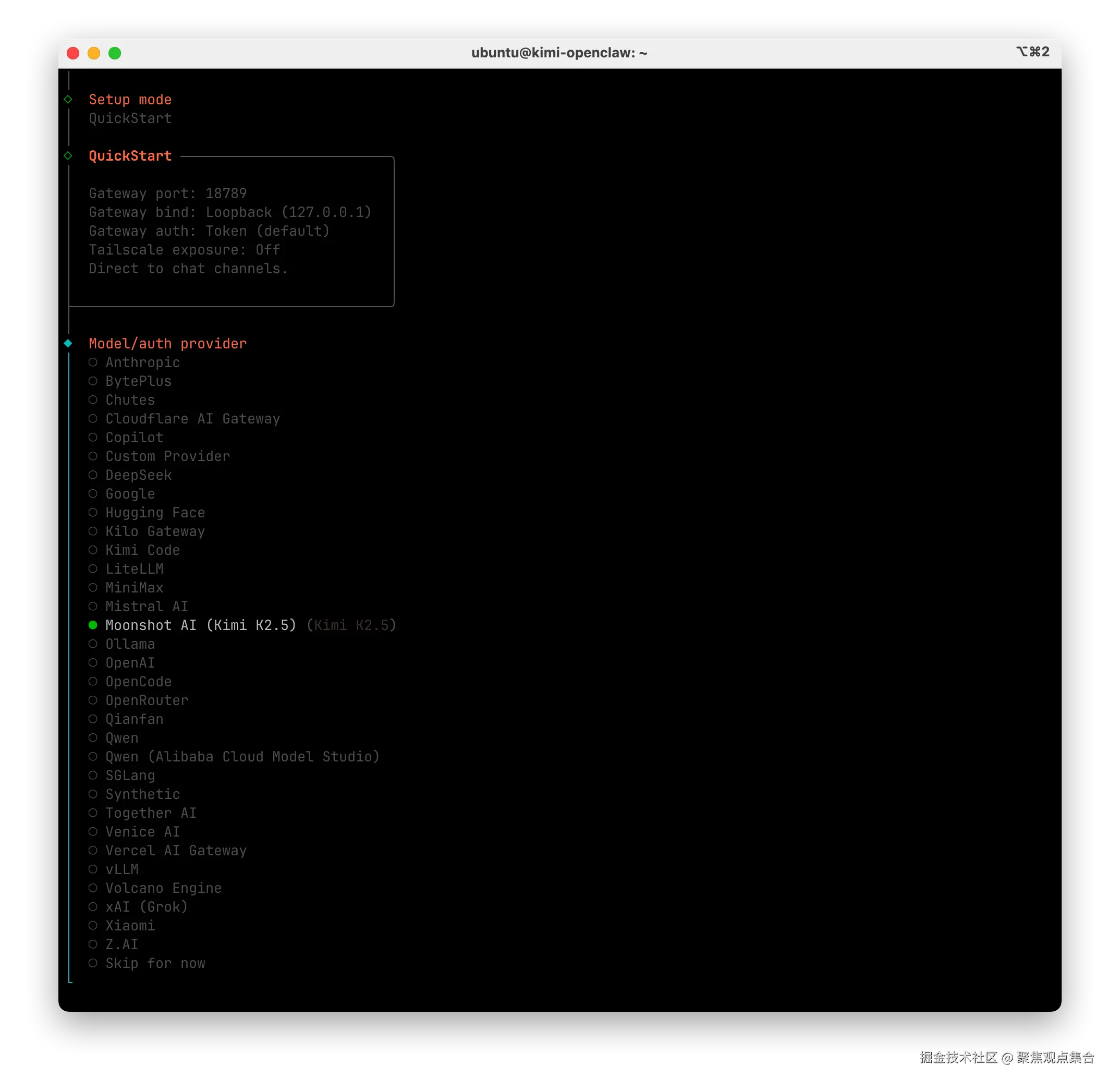 - 选择 Model,这里我们按需选择 OpenClaw 创始人推荐的 Moonshot AI(Kimi K2.5)/ Open AI/ Anthropic 作为基础模型。(本次选择的是 Kimi K2.5 进行演示)