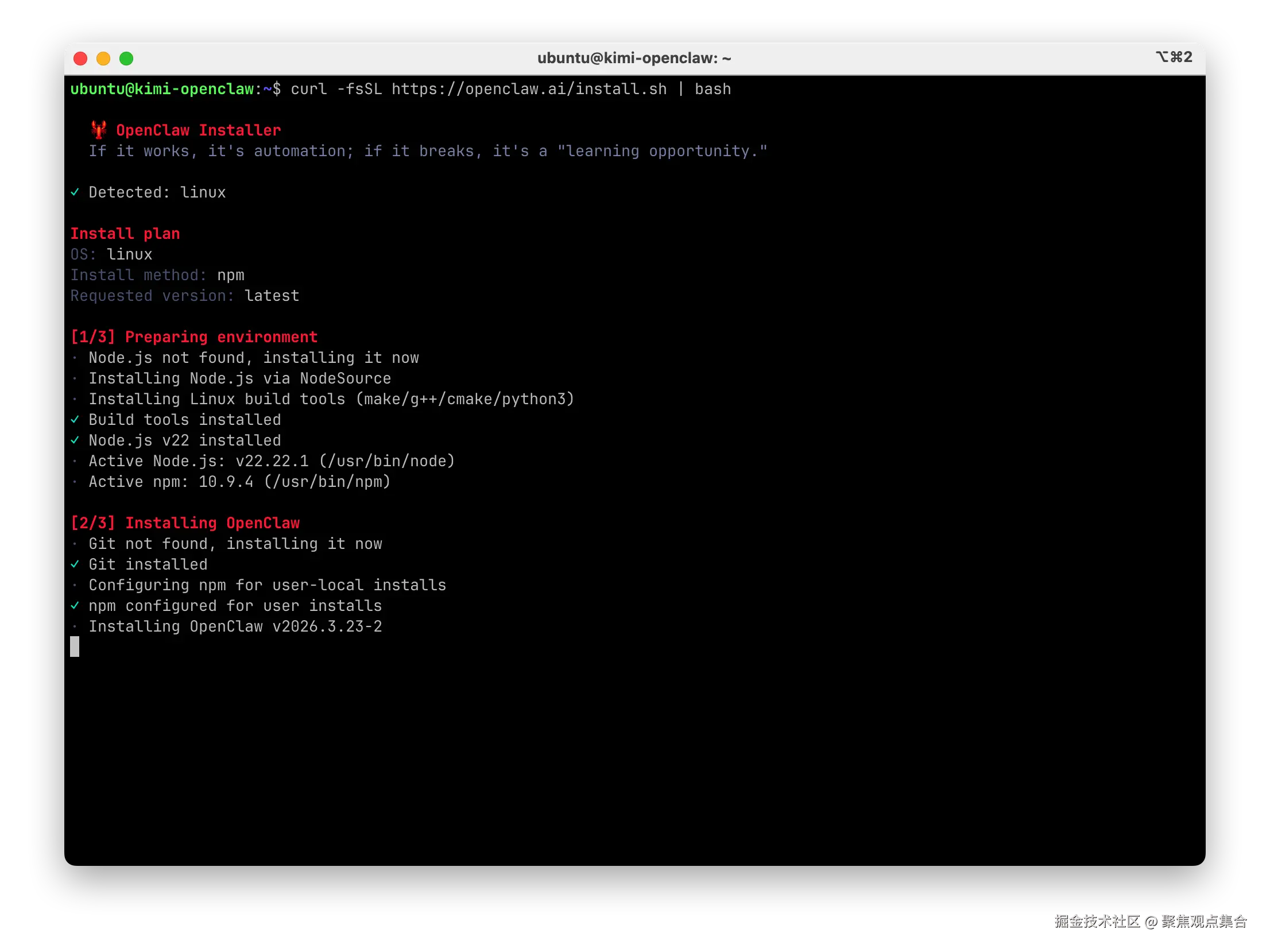 需要打开电脑终端软件,输入下面命令等待依赖和 openclaw 安装,主要依赖为 Node JS