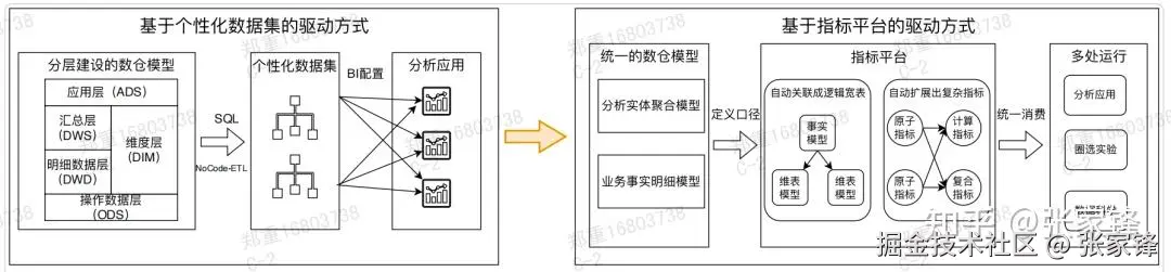 下图⽤“个性化数据集驱动”与“指标平台驱动”对⽐,能直观看到:指标平台试图把上层消费统⼀ 到“指标层”,但同时也意味着查询形态更复杂、Join更多、SQL更像机器⽣成代码,对底座提出更极端的要求。