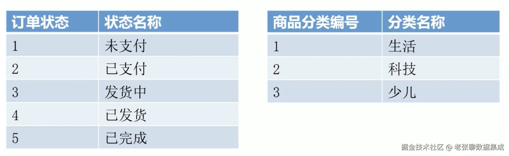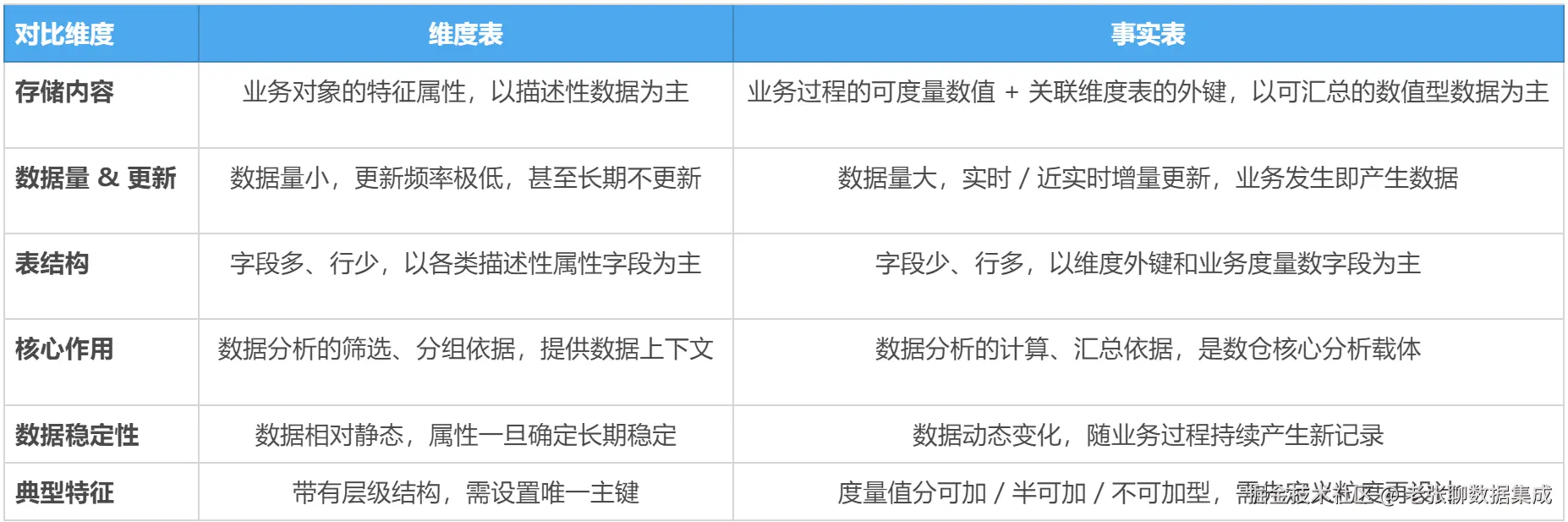 数据特征:数据量小、更新频率极低,甚至长期不更新。比如产品的基础属性、地域的层级信息,一旦确定就不会轻易变动,数仓中维度表的行数通常远少于事实表。