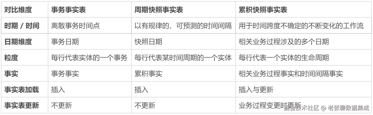 - 累积快照事实表, 用来记录一个业务对象完整生命周期内的状态变化。它的典型特征是一行数据包含多个时间字段,并且这行数据会随着业务推进不断被更新。这种表特别适合用来分析各业务节点之间的时间间隔,比如下单到支付的平均时长、支付到发货的平均时长,这类问题用事务事实表很难回答,但用累积快照事实表就很直接。
