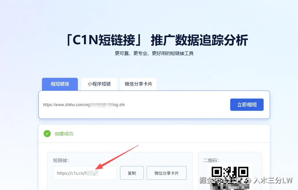 按上述步骤操作完之后,就可以获取到二维码背后的原始链接了,复制链接,然后在C1N短链接(c1n.cn)首页粘贴刚刚的链接,点击【立即缩短】即可得到对应的短连接了。