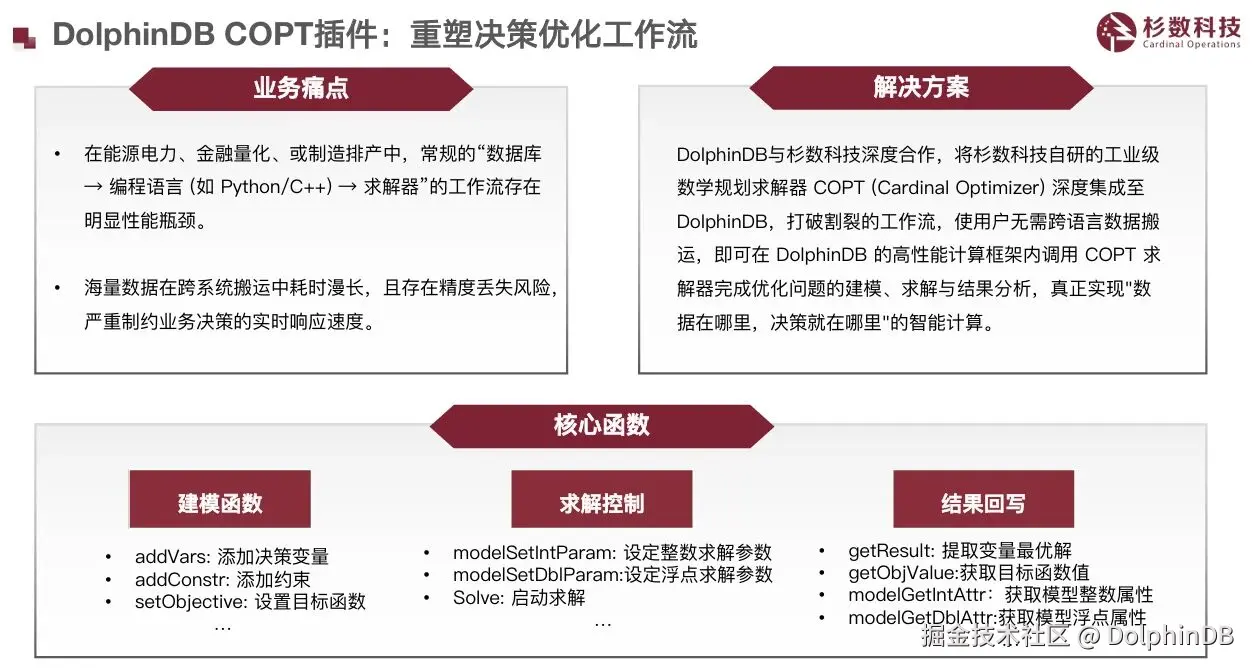 DolphinDB 与杉数科技的结缘,源于双方在技术上的深度共鸣。面对跨平台数据迁移与高效求解的双重挑战,杉数为 DolphinDB 打造了 COPT 插件,将自研数学规划求解器深度集成,真正实现了“数据在哪里,决策就在哪里”的通用智能方案。